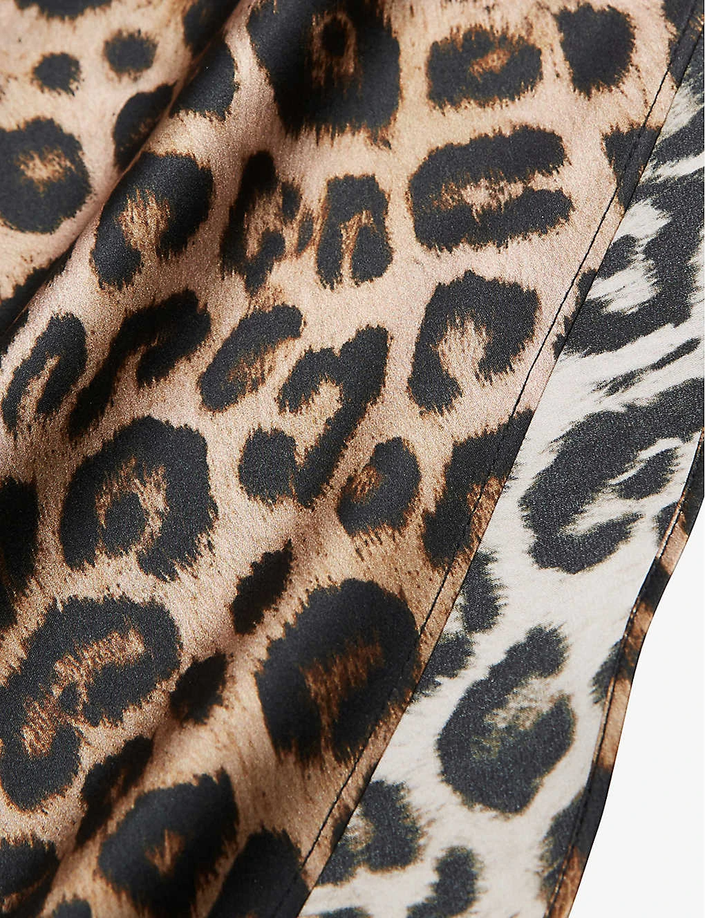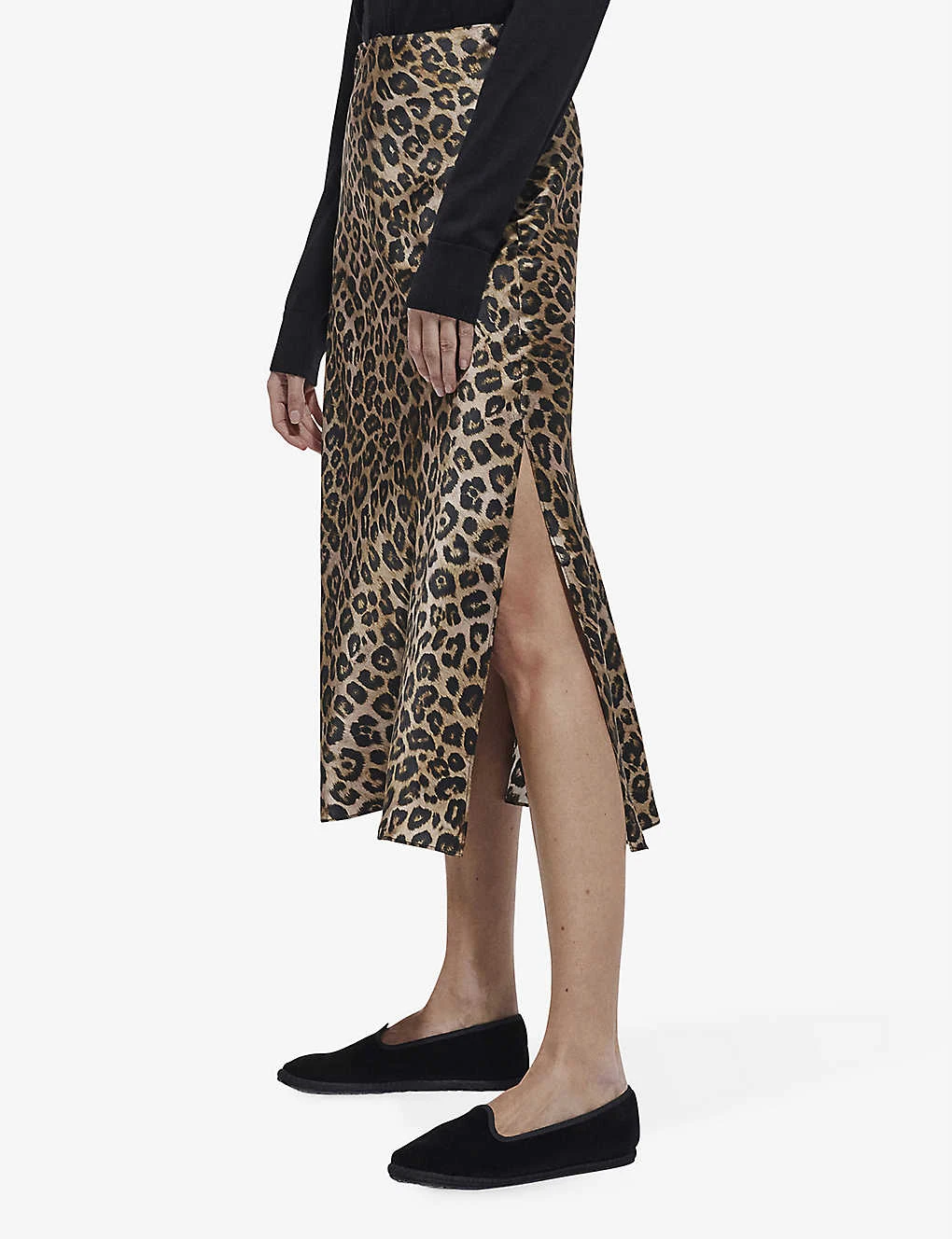 - Midi length, high waist, all-over leopard print, side slit, flared hem