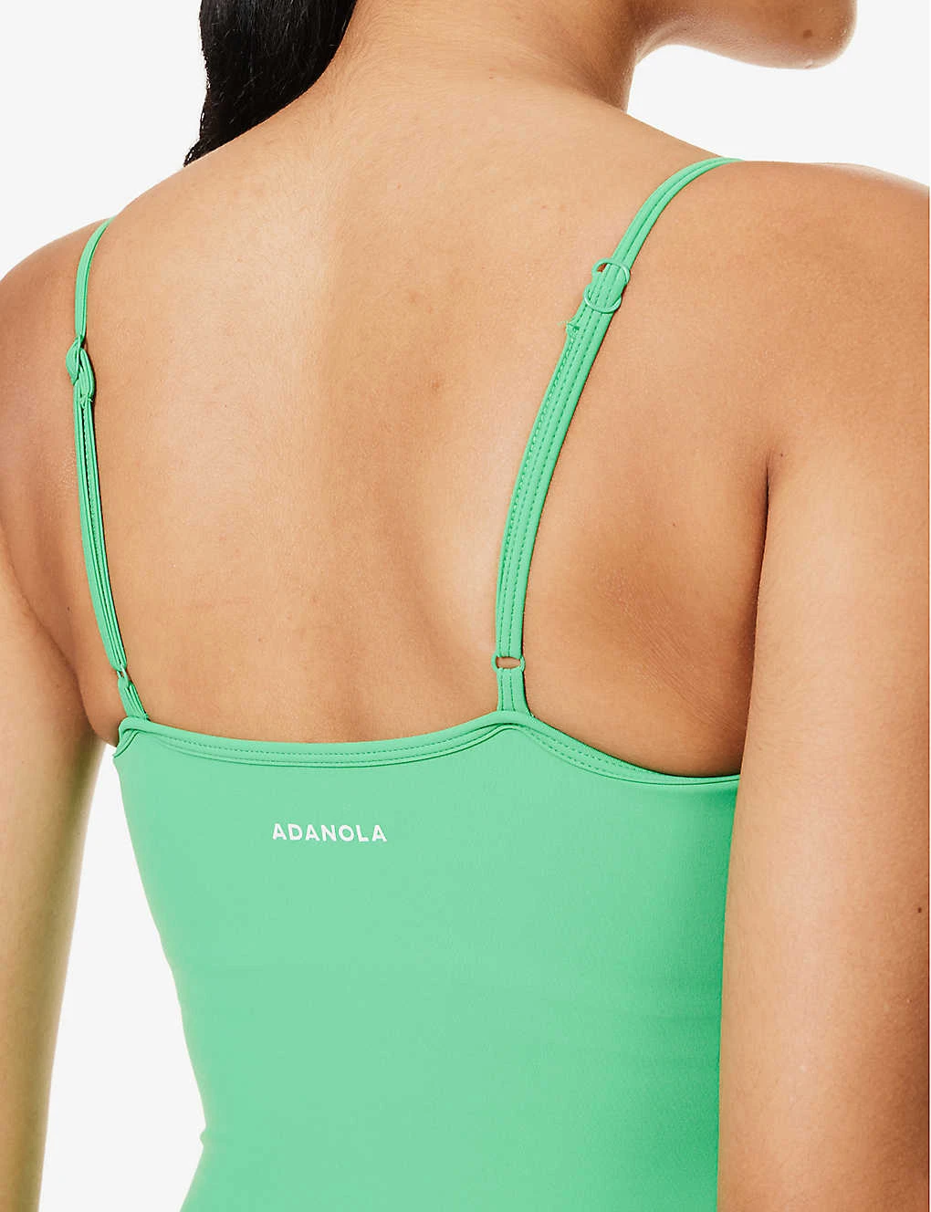 - Slim fit, V-neckline, adjustable straps, padded cups, removable pads, ruched design at front, exposed seam stitching, brand text print at back