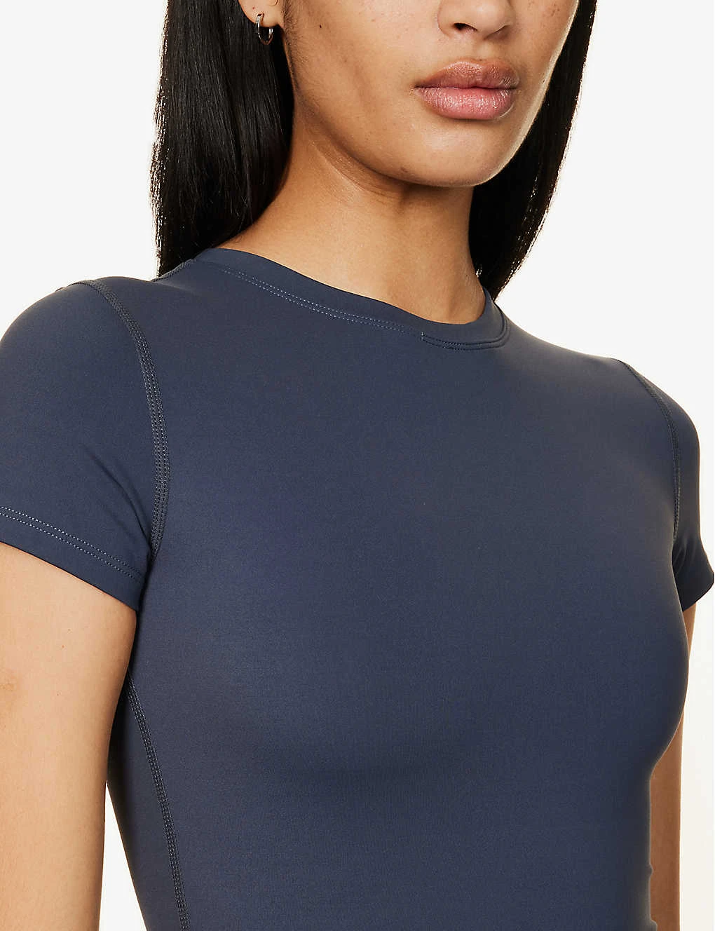 - Fitted, round neck, ribbed trim at neck, short sleeves, exposed seams