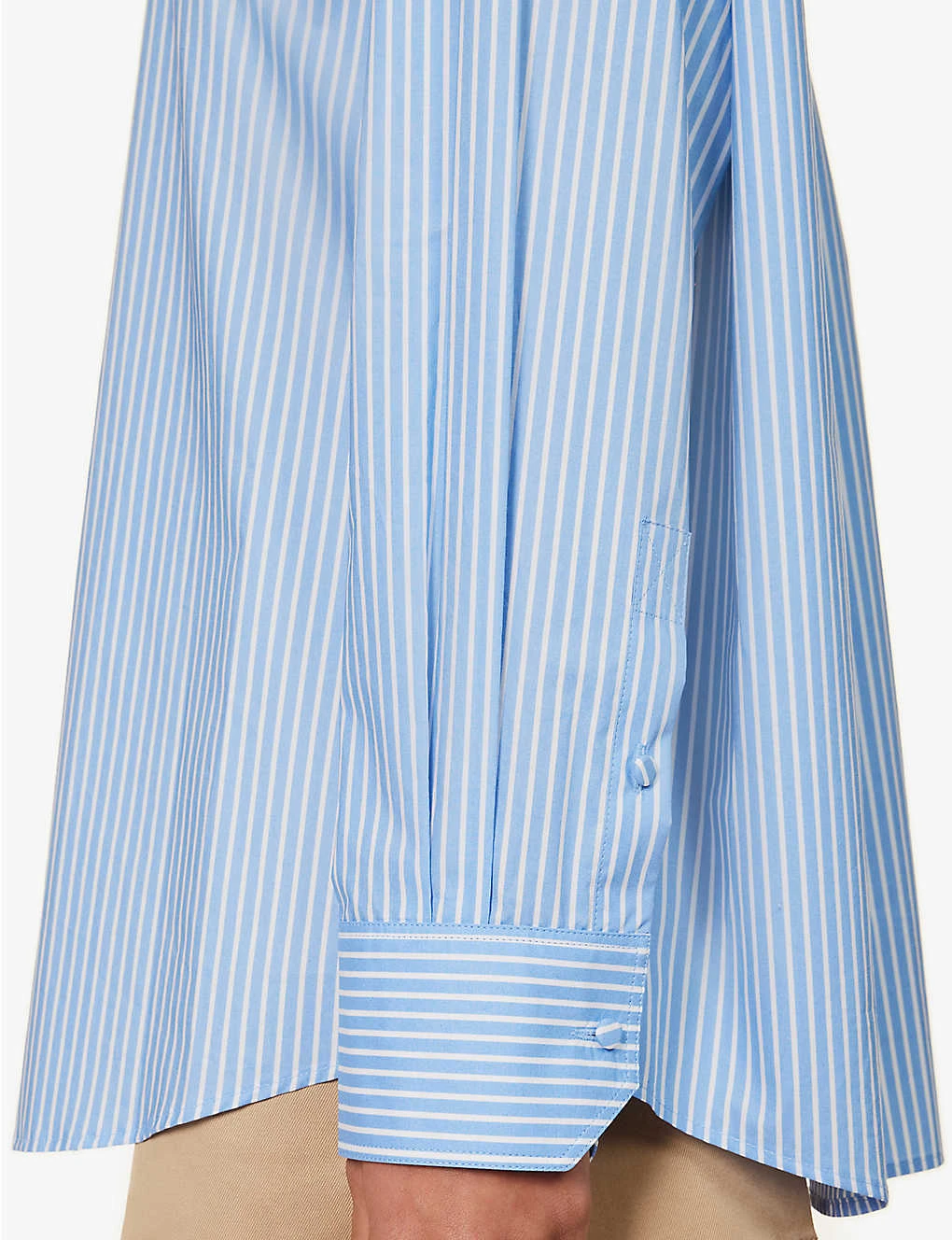 - Regular fit, collar, self-tie at neck, long sleeves, buttoned sleeve hems, straight yoke with pleat at back, all-over striped pattern, curved hem