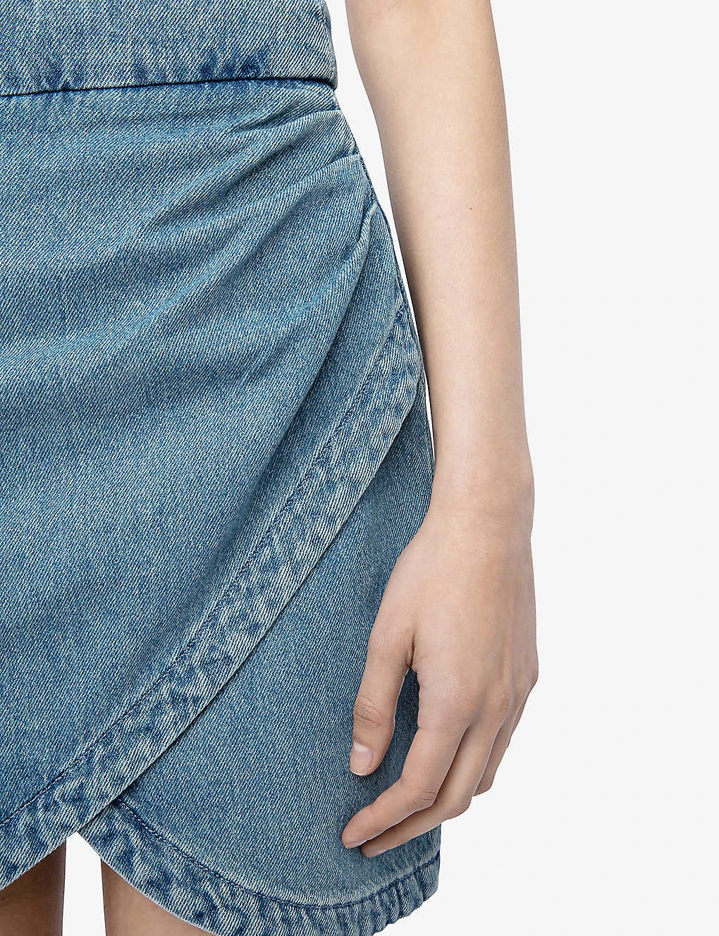 - Curved hem, gathered embellishments, high waist, faded wash