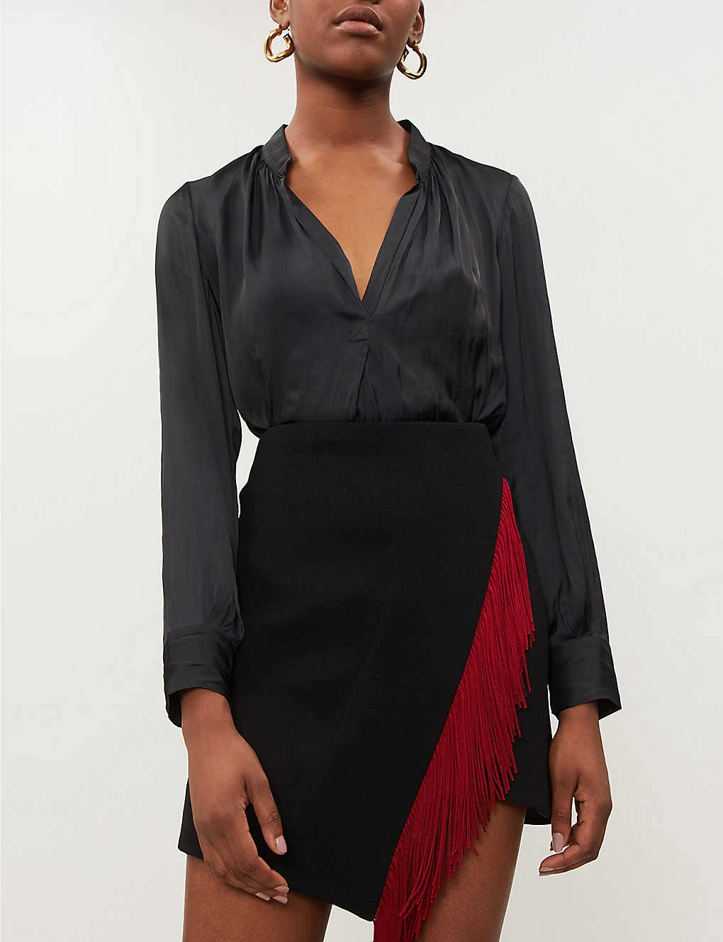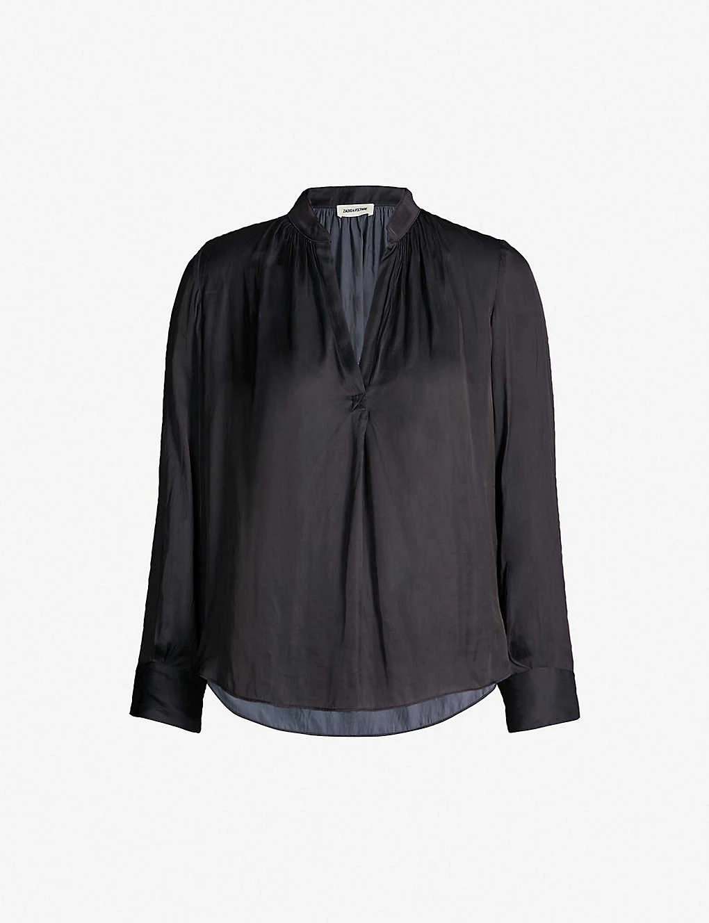 Zadig & Voltaire satin top Slips on Collar, V-opening at front, ruched detailing at front and back neckline, long sleeves, buttoned cuffs, pleated detailing at front, dropped back hem, curved hem 100% polyester Dry clean True to size Size small: Length 26″” Model is 5ft 10″” and wears a size small